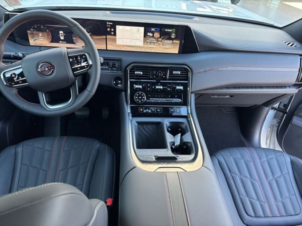 Inside, the Armada PRO-4X blends craftsmanship and comfort. PRO-4X quilted leather seat trim, genuine wood dashboard inserts, and carpeted PRO-4X floor mats elevate the cabin, while heated front seats, a heated steering wheel, and steering wheel memory provide premium convenience. The 8-way power driver seat with memory and power passenger seat ensure personalized comfort for every journey, and the split-bench 3rd-row seats recline to accommodate passengers or cargo. Tri-zone climate control with front dual zone A/C and HVAC memory keeps the cabin comfortable for all occupants.