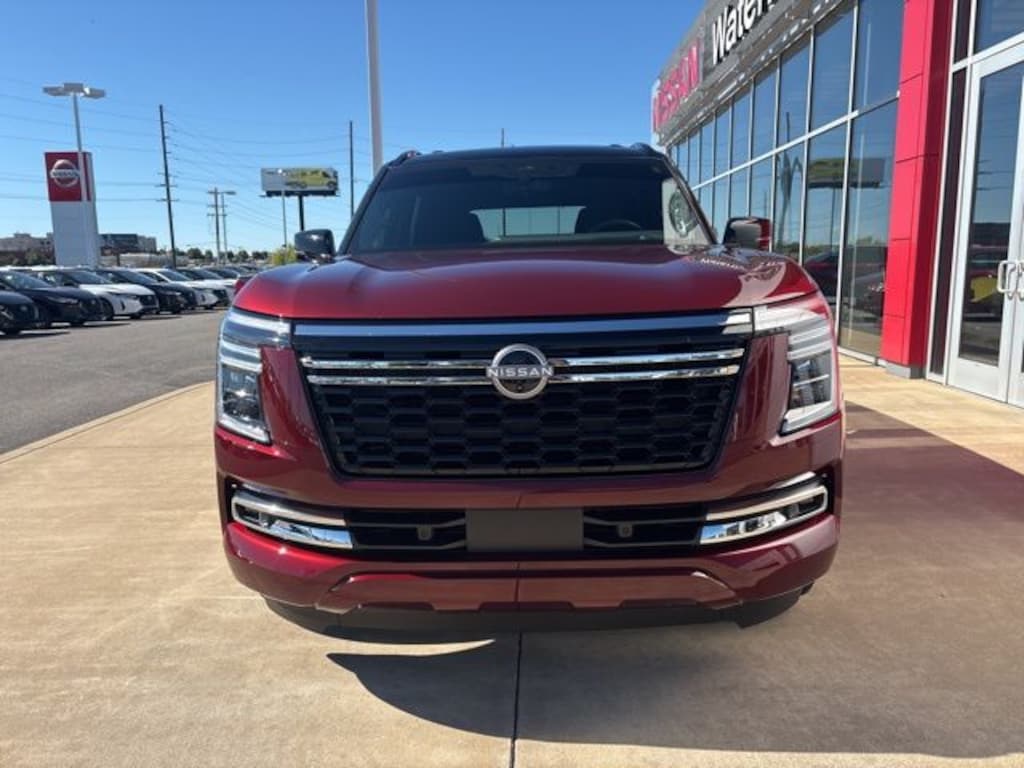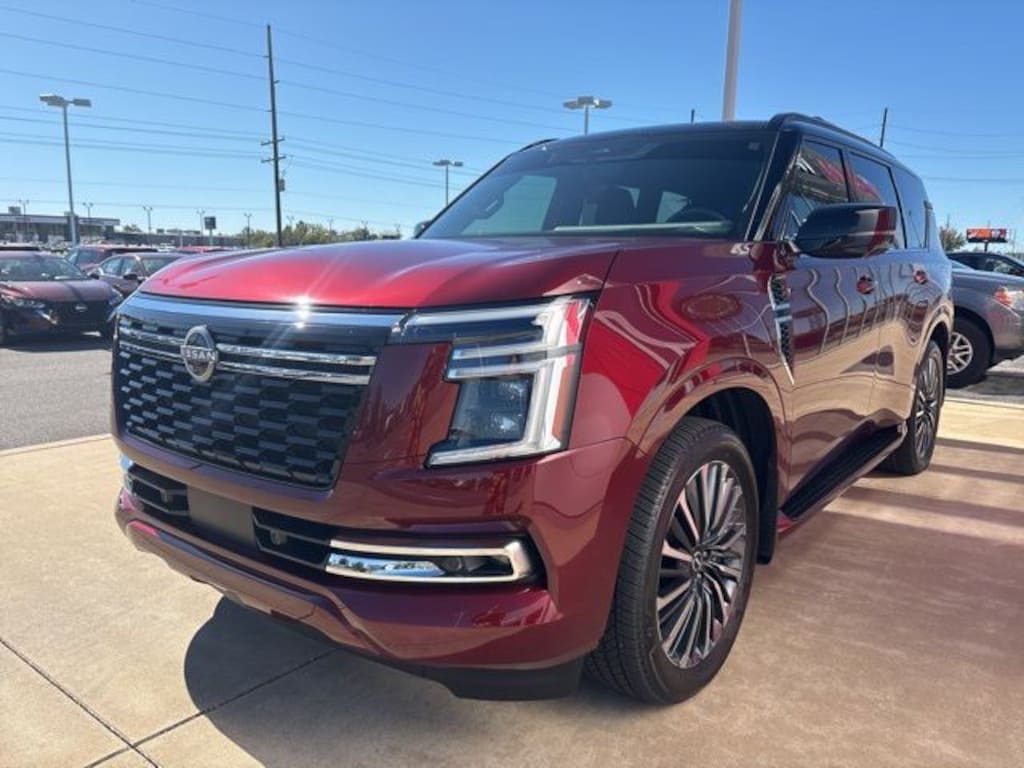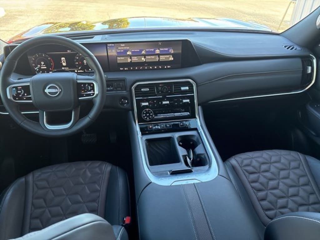 Owner's Demo. 4WD, 3rd row seats: split-bench, 8-way Power driver seat, Adaptive suspension, AM/FM radio: SiriusXM, Auto tilt-away steering wheel, Auto-dimming Rear-View mirror, Carpeted Floor Mats - Captain Chairs, Climate Controlled Heated & Ventilated Front Seats, Convenience Package, Emergency communication system: NissanConnect Services, Front Center Armrest, Front dual zone A/C, Fully automatic headlights, Garage door transmitter: myQ Connected Garage, Genuine wood dashboard insert, Heads-Up Display, Heated door mirrors, Heated front seats, Heated rear seats, HVAC memory, Illuminated entry, Illuminated Kick Plates, Illuminated Scuff Plate, Intelligent Auto Headlight, Low tire pressure monitor, Memory seat, Navigation System, Panoramic Headliner Illumination, Power Liftgate, Power passenger seat, Power sliding moonroof w/ tilt, Power steering, Power windows, Premium Paint & 2-Tone Roof, ProPILOT Assist 2.1 (PLAT RESERVE Grade), Quilted Leather Seat Trim, Rain sensing wipers, Rear Bumper Protector, Rear reading lights, Rear window defroster, Reclining 3rd row seat, Remote keyless entry, Roof Rail Cross Bars, Speed-Sensitive Wipers, Splash Guards, Steering wheel memory, Steering wheel mounted audio controls, Telescoping steering wheel, Tilt steering wheel, Turn signal indicator mirrors, Ventilated front seats, Wheels: 22" Painted Alloy. 2025 Nissan Armada Platinum Reserve