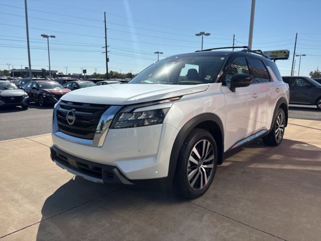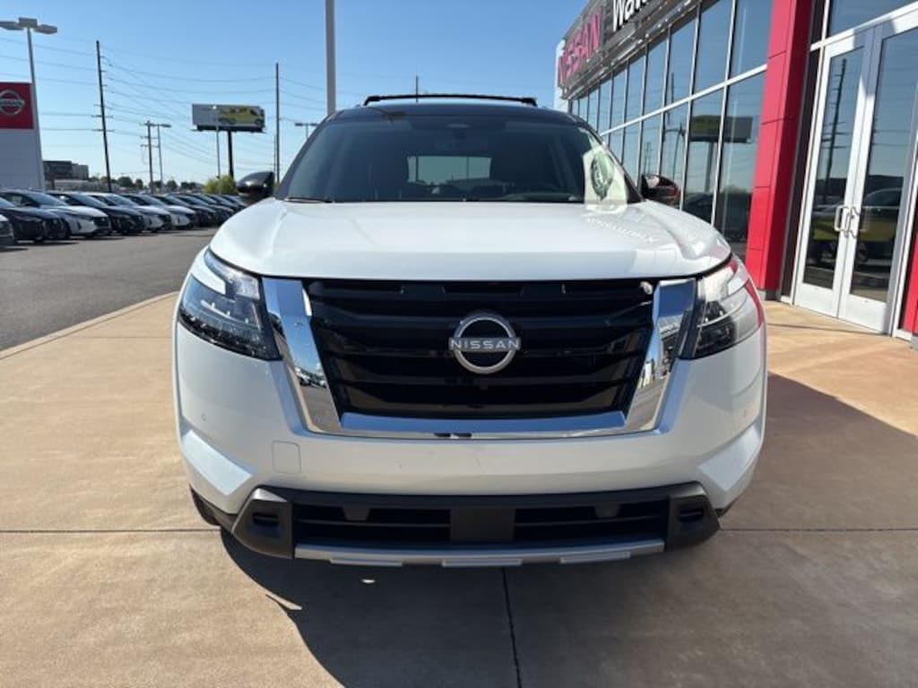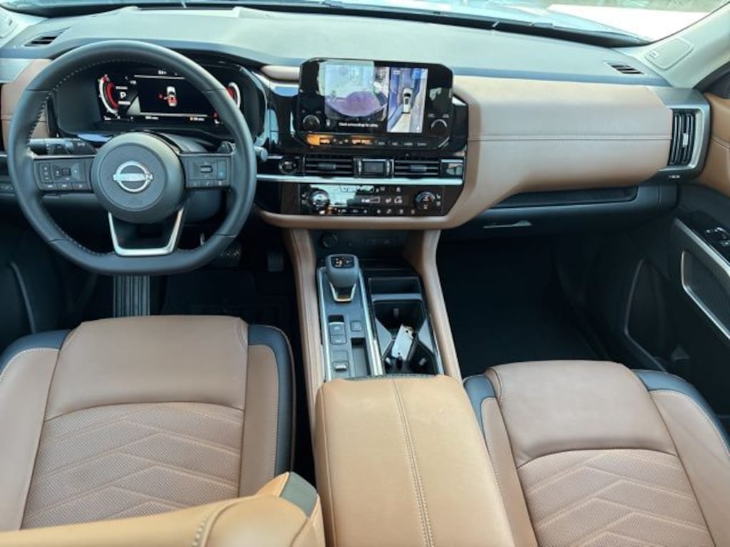 The 2025 Nissan Pathfinder Platinum combines luxury, versatility, and advanced technology, making it the perfect SUV for families and adventurers alike. Featuring semi-aniline leather-appointed seating surfaces and 2nd-row captains chairs with rear headrests from the Platinum Captain Chairs Package, it offers spacious comfort for up to seven passengers. The 8-way power drivers seat with memory, heated front and rear seats, and dual-zone automatic climate control ensure a comfortable ride in any weather.